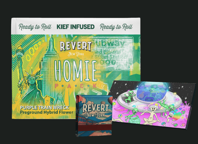 Purple Trainwreck combines sweet berry notes with earthy, slightly spicy undertones. The experience is uplifting at first with a smooth, relaxed finish, making this Homie Pack a great option for creative sessions, social hangs, or easing into the evening. Purple Trainwreck – Homie Pack 14g Kief-Infused Ground Flower + Matchbook + Custom Rolling Papers. Each Revert Homie Pack includes 14g of kief-infused ground flower, a Revert-branded matchbook, and a premium set of custom rolling papers. The packaging features original artwork by Jean Sotansky (@loves.colors), with proceeds supporting Jean’s ongoing creative work. Artwork by Jean Sotansky (@loves.colors)