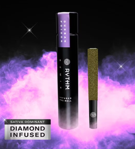 A sativa-dominant strain with a complex palette of sweet, earthy, piney flavors, Durban Poison is known to keep energy sparked. Remix pre-rolls feature RYTHM premium indoor flower double infused with THCa diamonds and kief for maximum potency and fine-tuned with 100% natural terpenes.